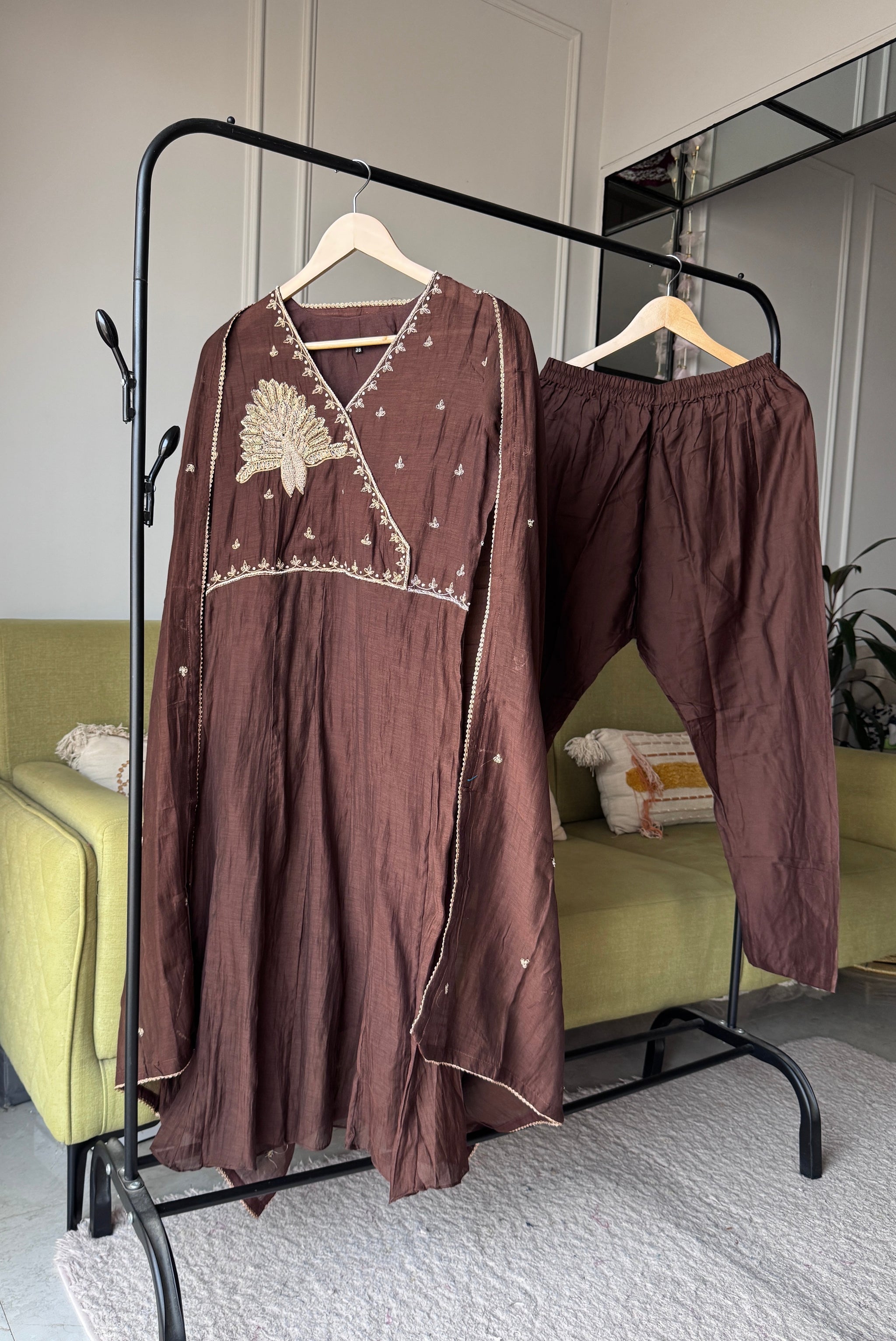 Kiran Handwork Mul Chanderi Anarkali Dress- Brown