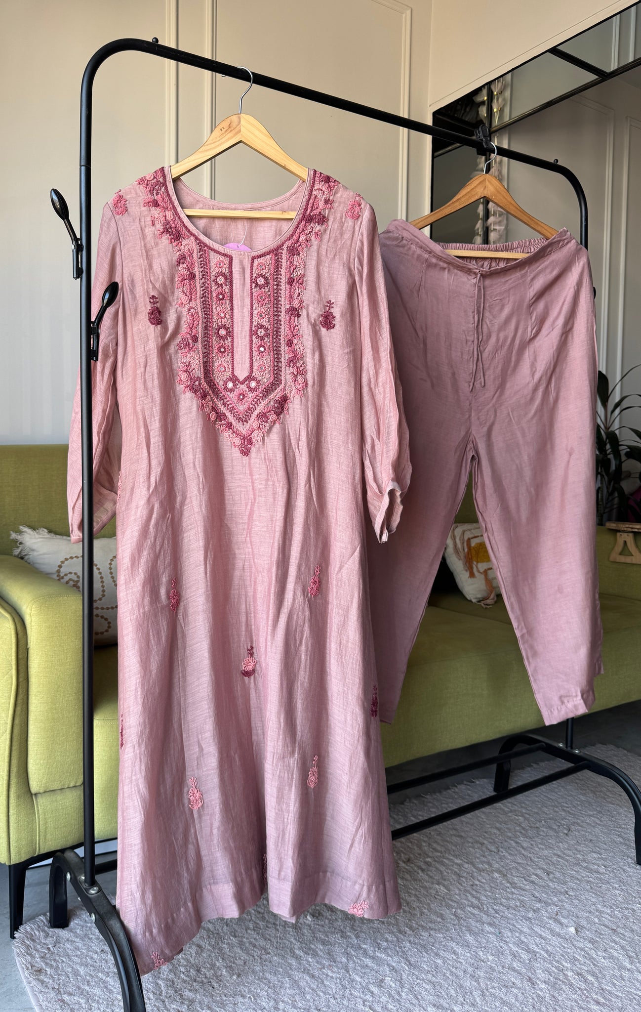 Rinkle Embroided Mul Chanderi Dress- Dusty Pink
