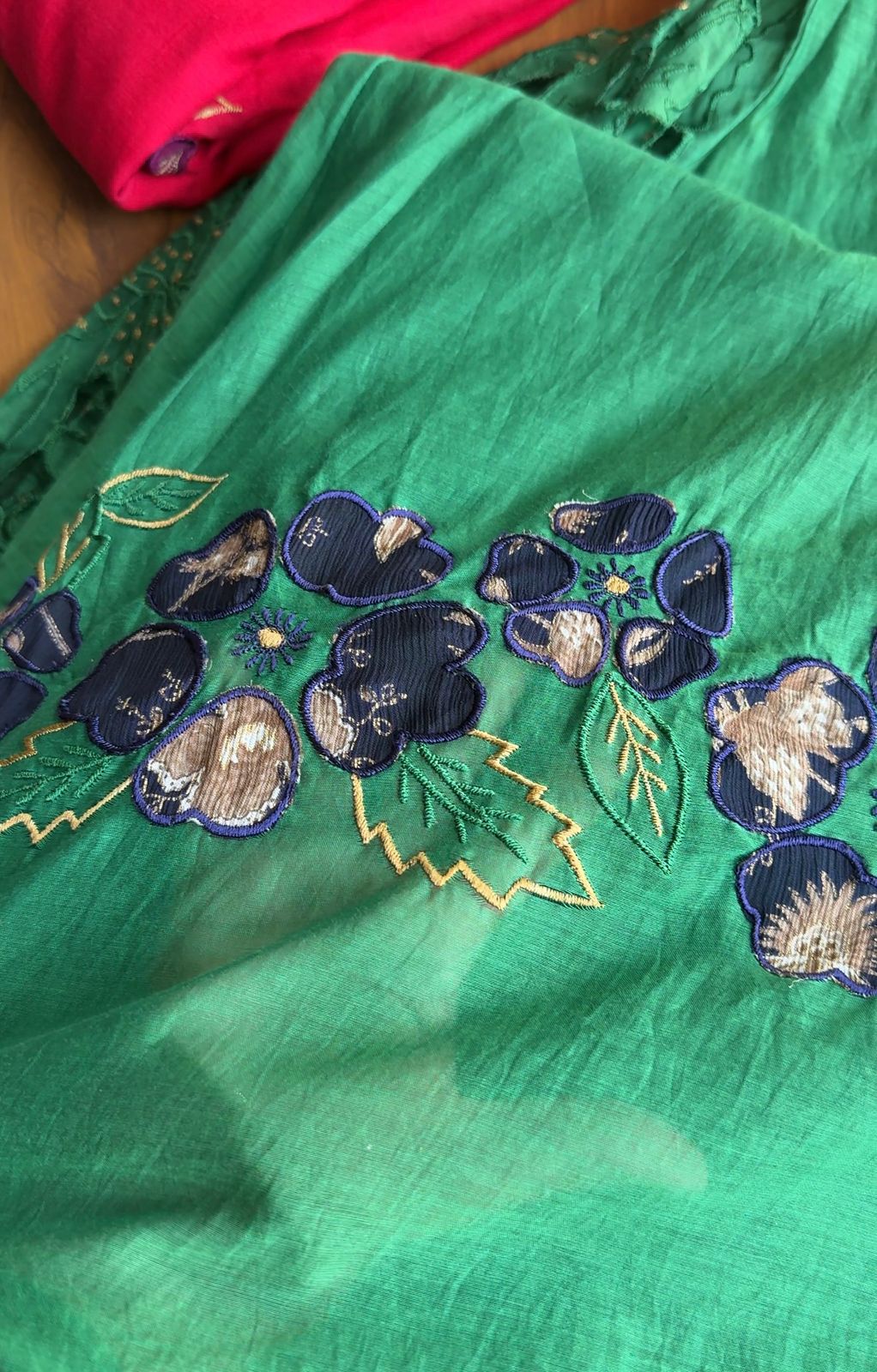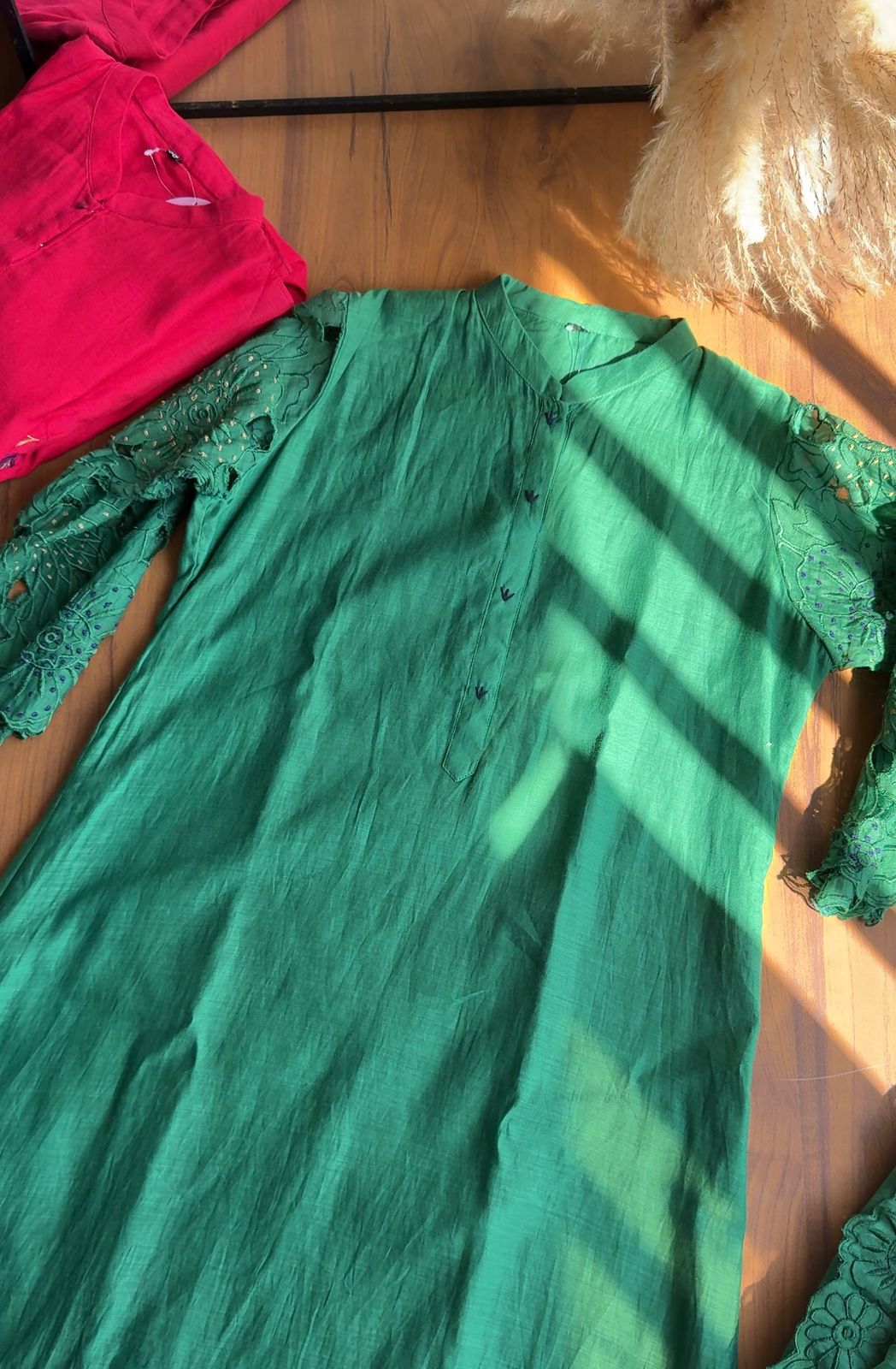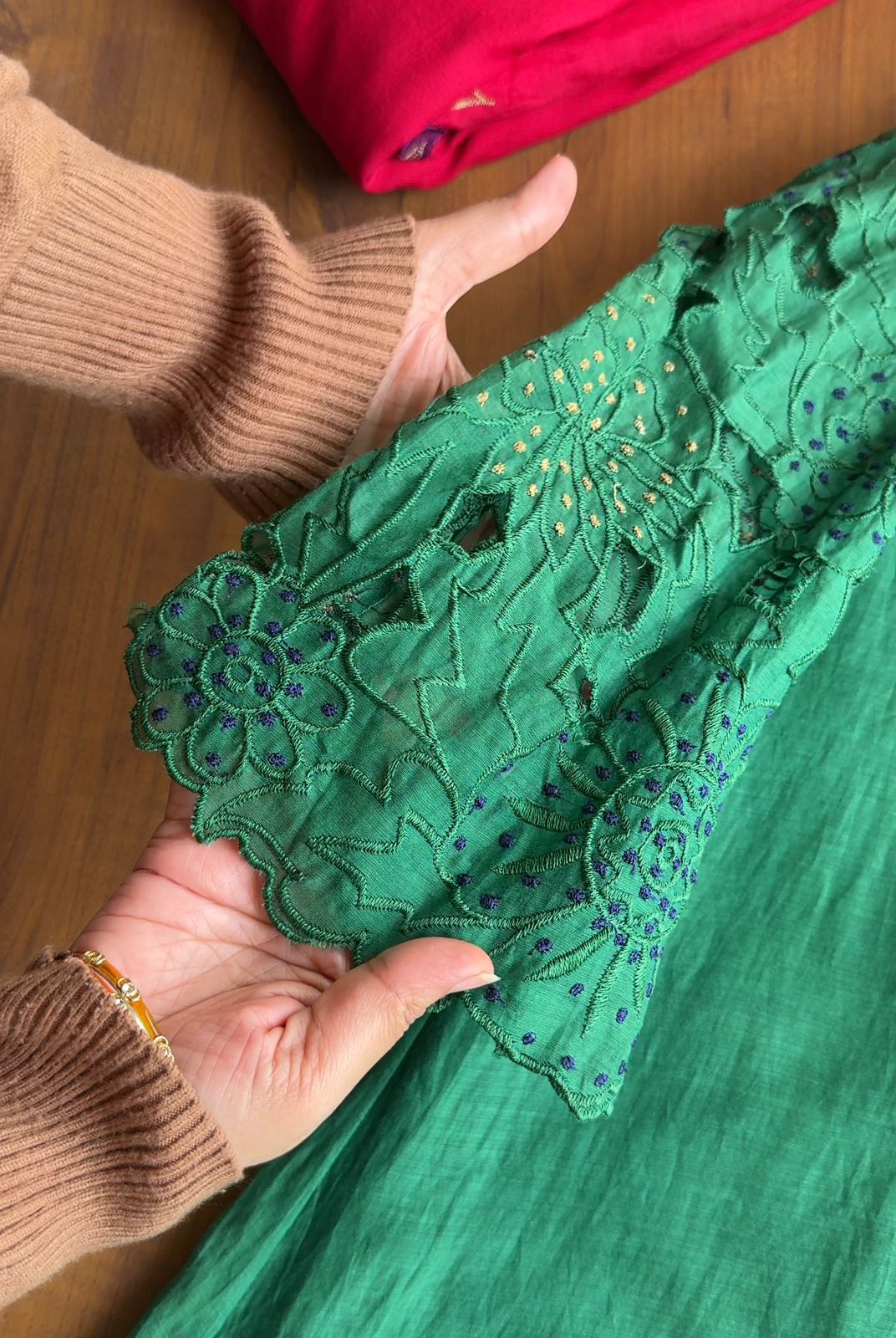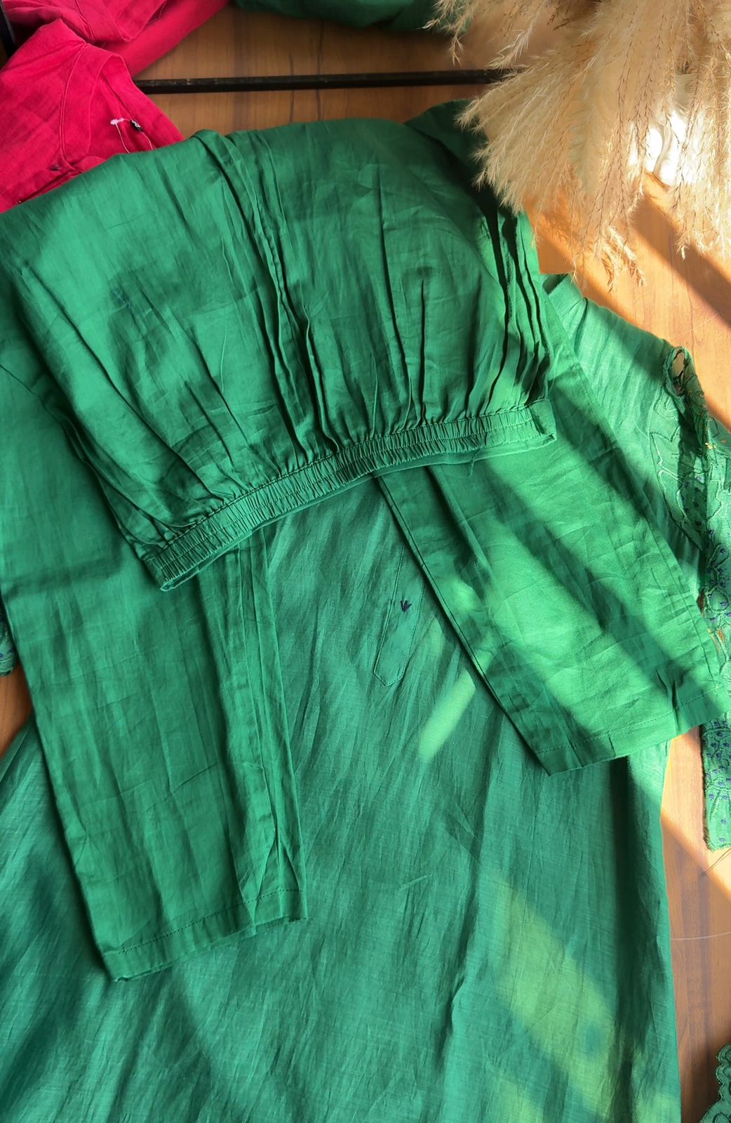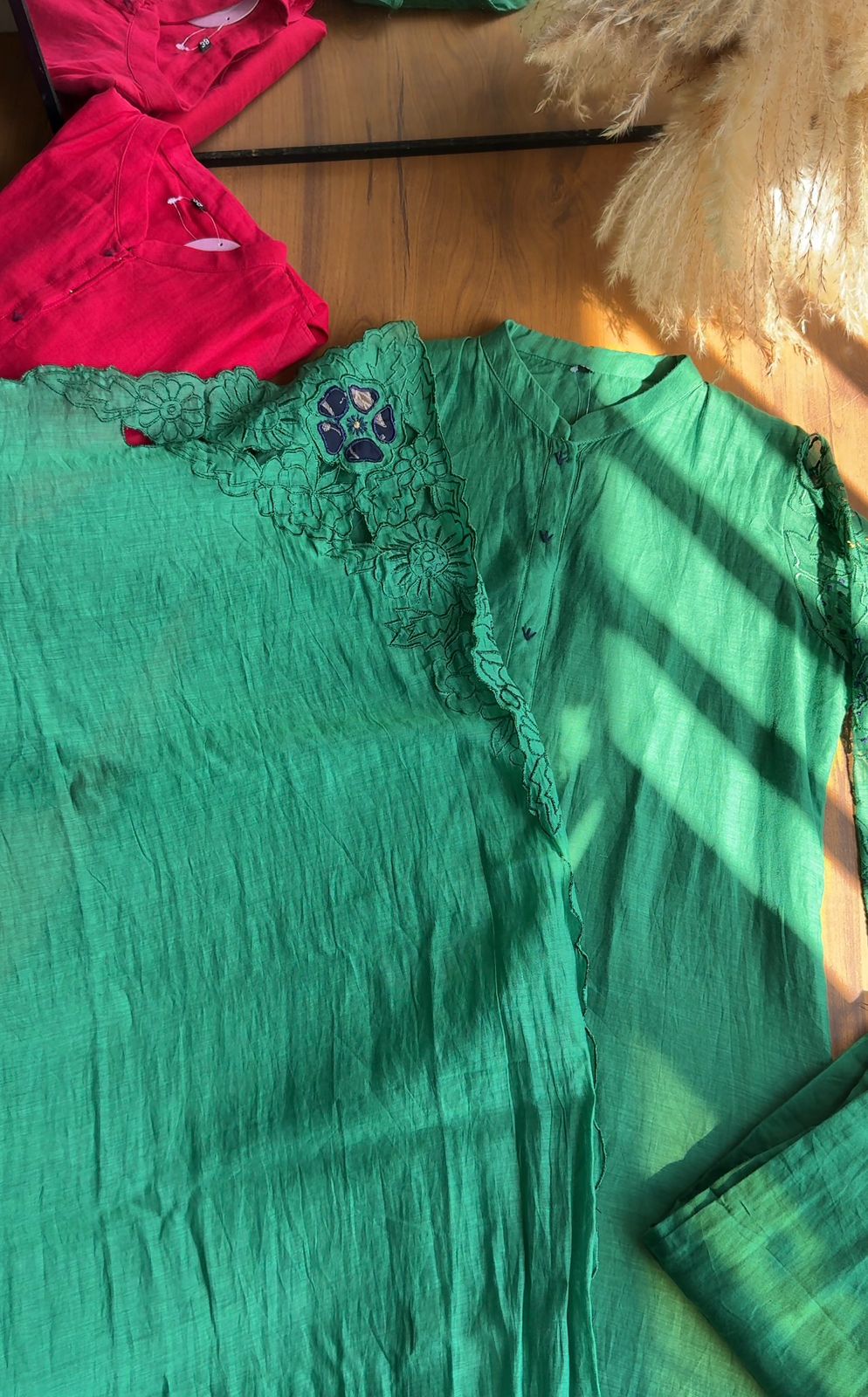 Embrace effortless glamor with this beautifully tailored green mul chanderi Cutwork Embroidered three piece Set. kurta has cutwork embroidery, chinese collar neckline and quarter sleeves with scalloping detail. It's comes with pants and Its dupatta also has cutwork done on it for a stylish look. elasticated waist and dupattaÂ