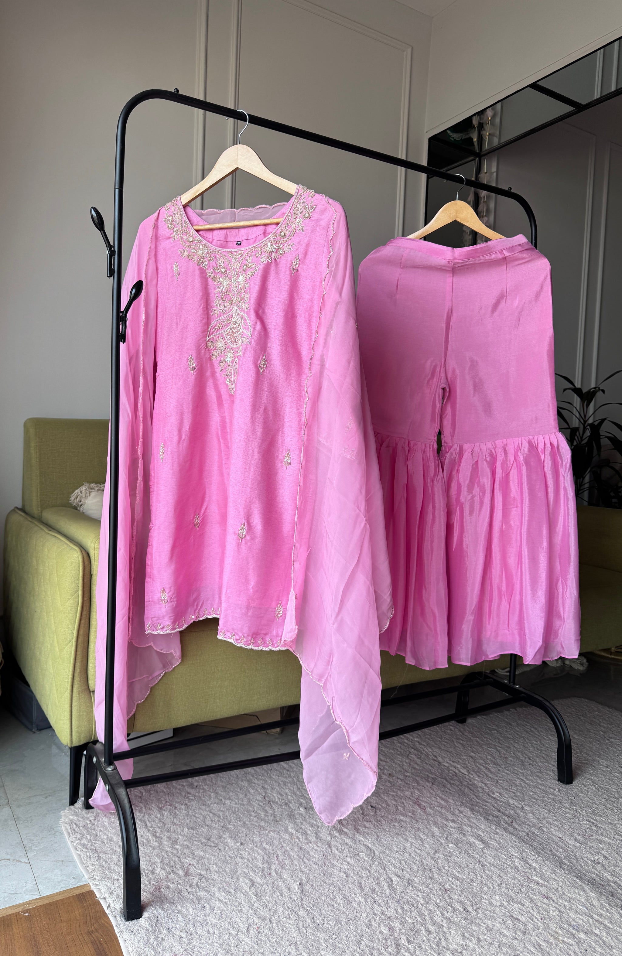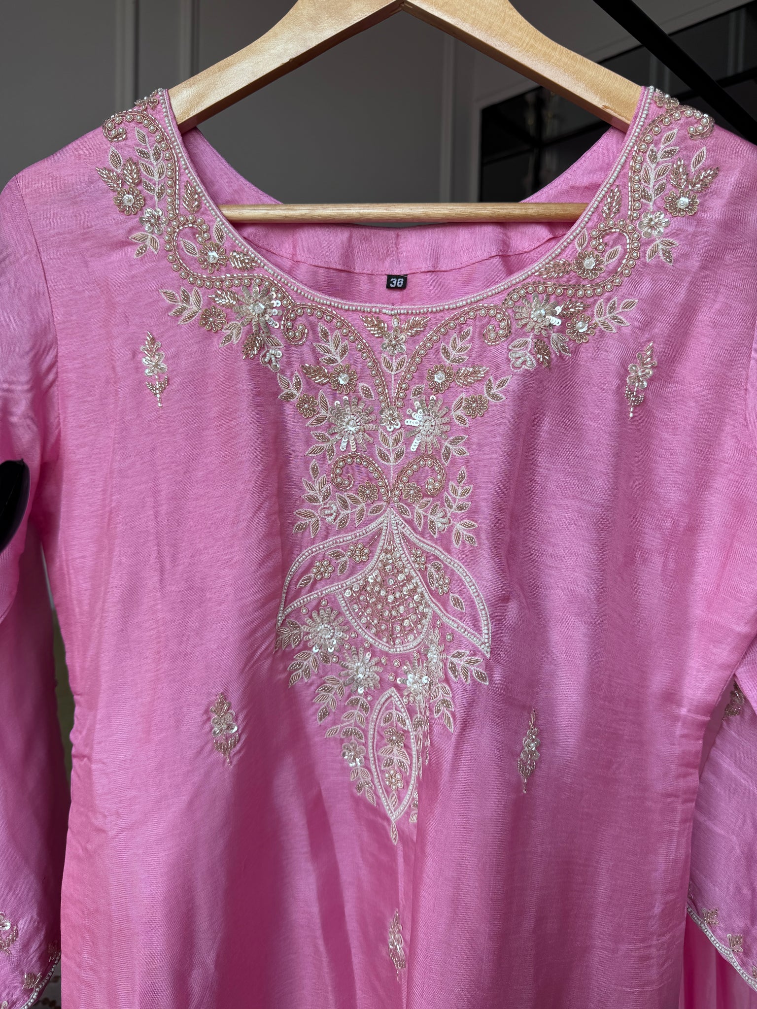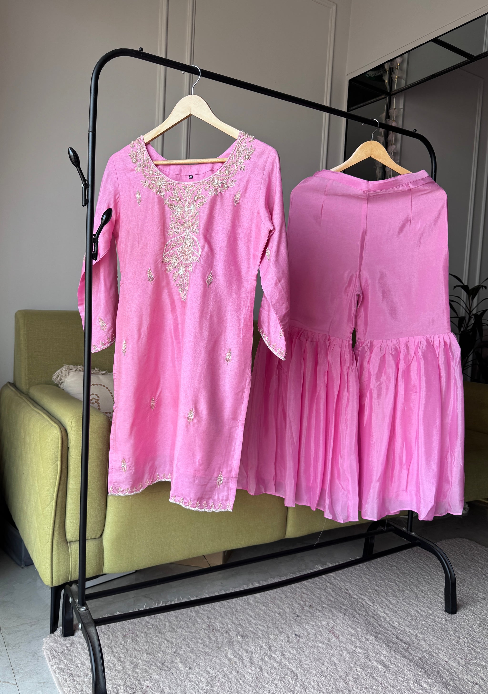 Rajvi Handwork Short Kurta With Plazzo Set- Baby Pink